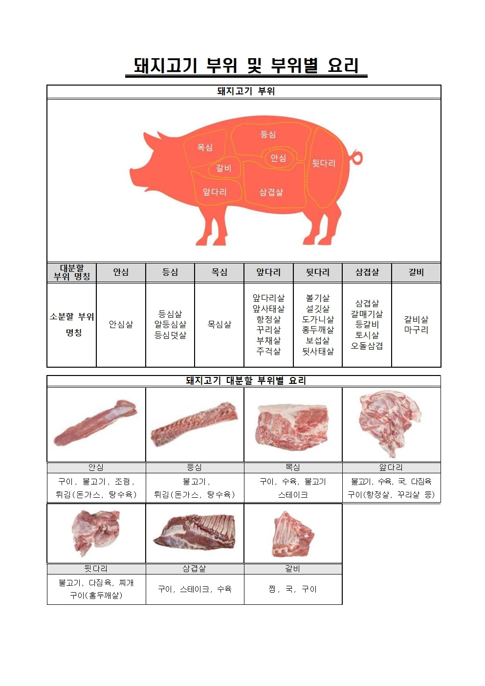 - 담백한 부위: 앞다리살, 뒷다리살 → 수육, 불고기 추천